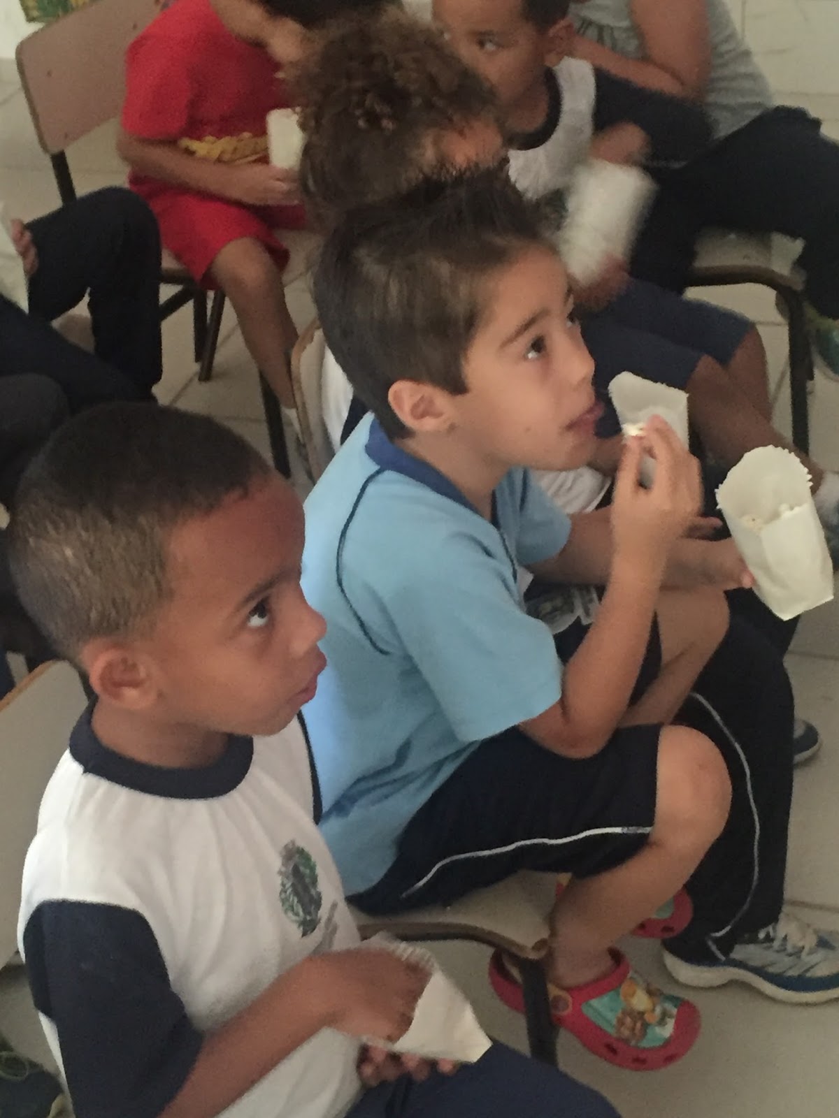 As crianças da turma gostam muito de pipoca, ainda mais quando vem acompanhada de um vídeo que elas mesmas escolheram. Professora Lúcia